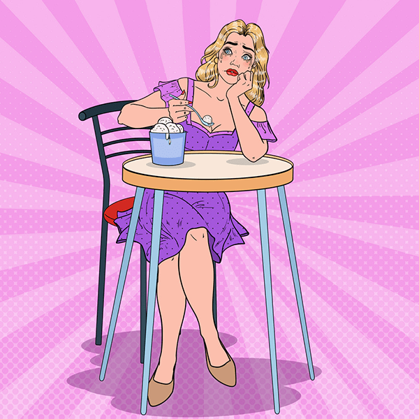 She was depressed. The cup of ice-cream was next to her. «No, it is not enough», she thought and went to the kitchen to bring a bucket of «Ben & Jerry’s chocolate chips» and pizza and soda and popcorn and more and more…